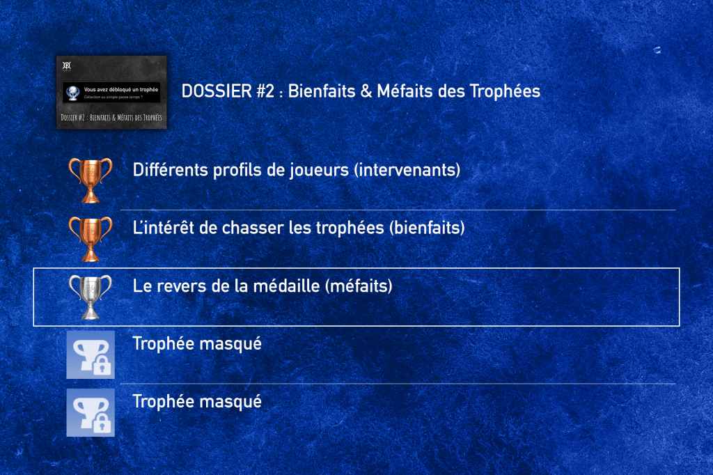 Merci encore pour ton invitation à donner mon avis sur les trophées ! Comme toujours, tu as fait un formidable travail d’analyse et de synthèse avec ce dossier, qui est passionnant à parcourir. Ça aide à comprendre bien mieux les motivations de certains pour les trophées, tout comme de voir que certains n’en sont tout simplement pas passionnés. Indéniablement, le trophée a un petit aspect social plus fort que je ne l’imaginais et qui est riche d’anecdotes. C’est fascinant de voir les réactions et ressentis de chacun sur ces trophées, leur diversité – et en même temps, ils aident aussi à nous lier en tant que joueurs !