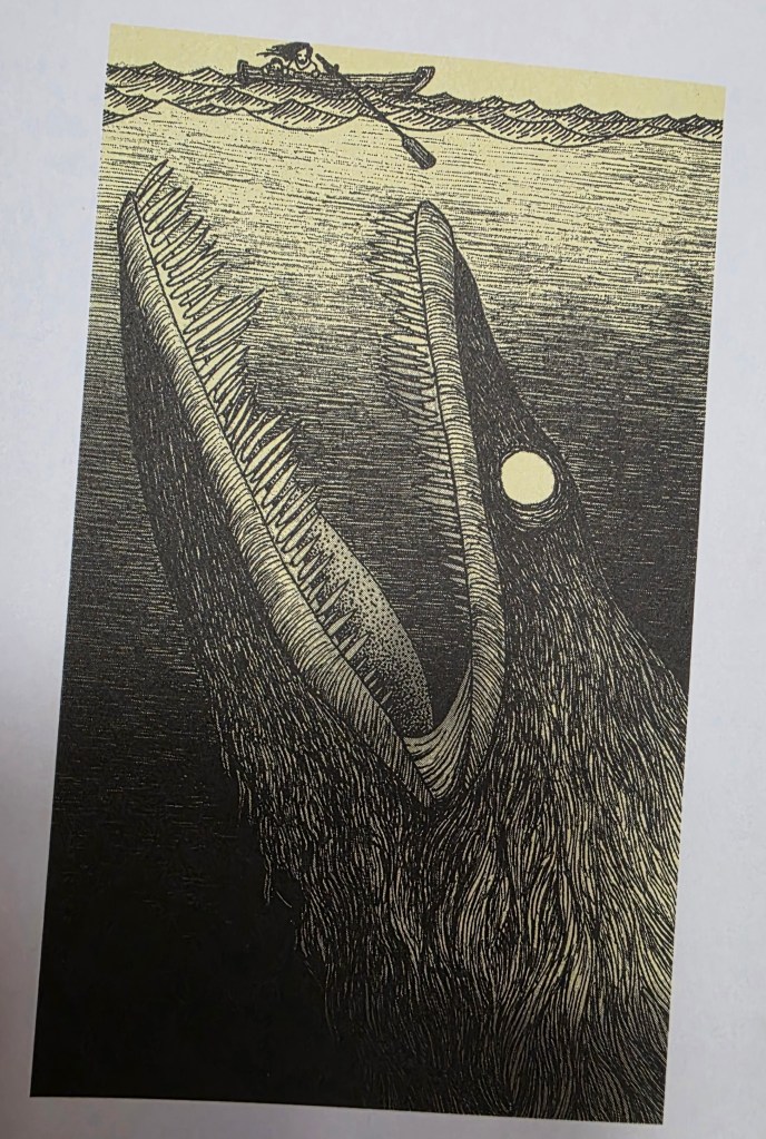 Hélas, ils sont de nouveau bloqués, un peu plus loin. Non seulement les mines marines sont de plus en plus nombreuses ; mais une épave de navire de guerre se situe devant eux. Or, une baleine est coincée dans la carcasse du bateau. Le frère et la sœur pénètrent à l’intérieur de l’épave. La baleine possède un corps étrangement allongé et a les yeux crevés. Elle est en piteux état, mais vivante et inoffensive. Peut-être fait-elle référence au conte Pinocchio, de Collodi, ou encore au roman Moby Dick, de Melville.