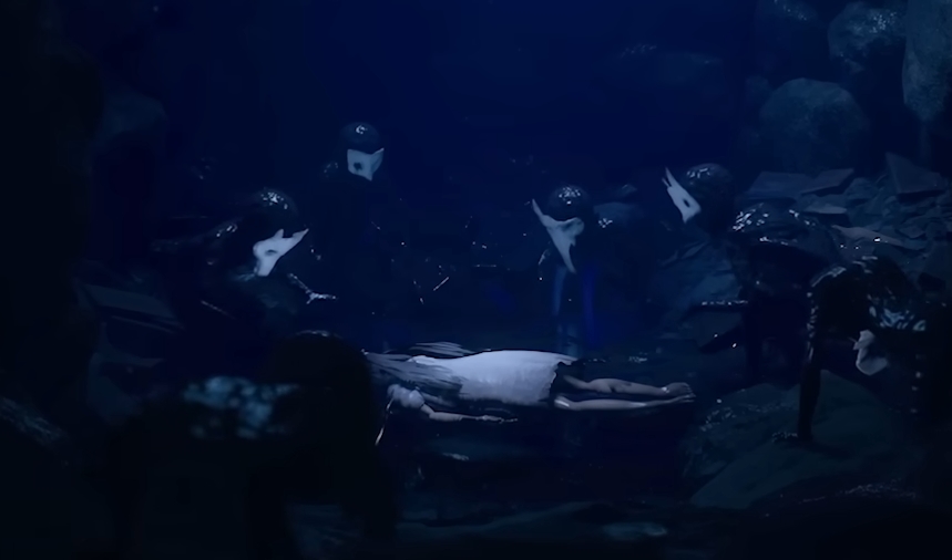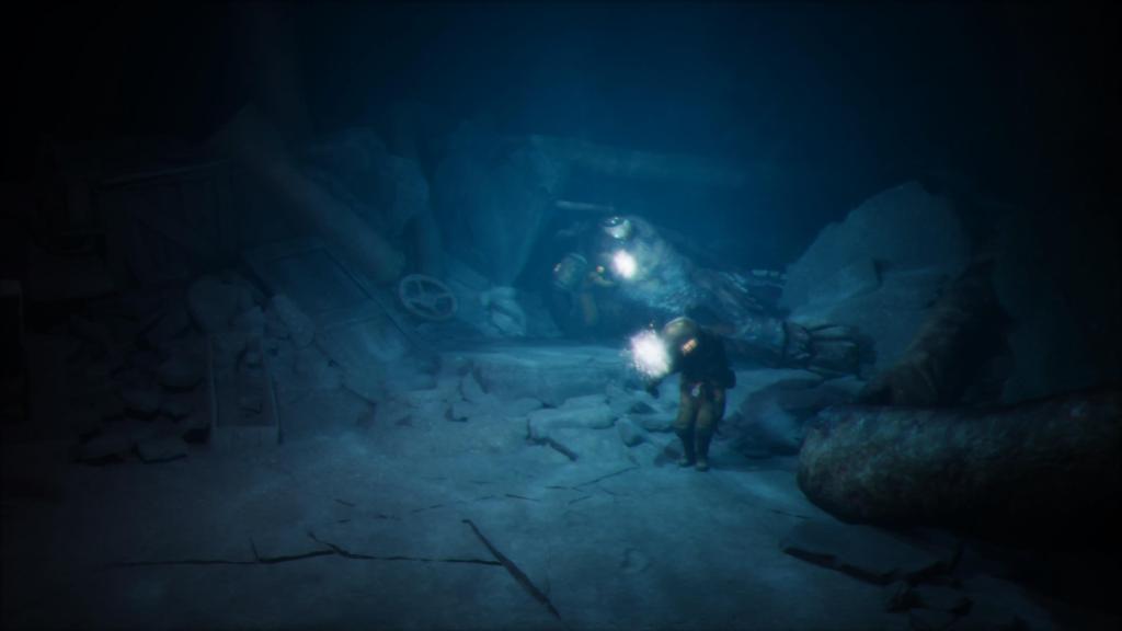 Les deux protagonistes décident de s’habiller en scaphandriers afin de faire une excursion sous-marine. Ils retrouvent le cadavre de la créature abattue un peu plus tôt. Il s’agit d’un squelette dont le corps est humanoïde et la tête similaire à celle d’un cheval. D’après l’encyclopédie du jeu, il s’agit d’une créature appartenant au folklore scandinave : le bäckahäst. Cela signifie littéralement « cheval des ruisseaux ». D’après la légende, il s’agit d’un bel animal, portant des cavaliers avant de plonger dans l’eau, afin de les noyer. Nos deux héros n’ont pas de meilleure idée que d’entreprendre une énucléation oculaire. Ils ont l’intention de faire don de cet œil à la baleine. Or, le cheval des ruisseaux n’est pas tout à fait mort, ni d’accord. Sans crier gare, il se réveille et se lance à la poursuite des enfants. Ceux-ci s’engouffrent dans la cage anti requins, pour remonter à la surface, dans une scène digne des Dents de la Mer (1975). Une fois encore, on salue la façon dont Reanimal rend hommage au cinéma d’horreur, de manière plus ou moins volontaire. Il propose surtout des séquences de gameplay inédites, grâce à l’utilisation d’environnements naturels et d’objets appartenant à l’univers de la guerre. Après avoir retrouvé la vue, la baleine se libère de l’épave et s’en va. Les enfants peuvent reprendre leur route, en barque. Ainsi se clôture le deuxième acte.