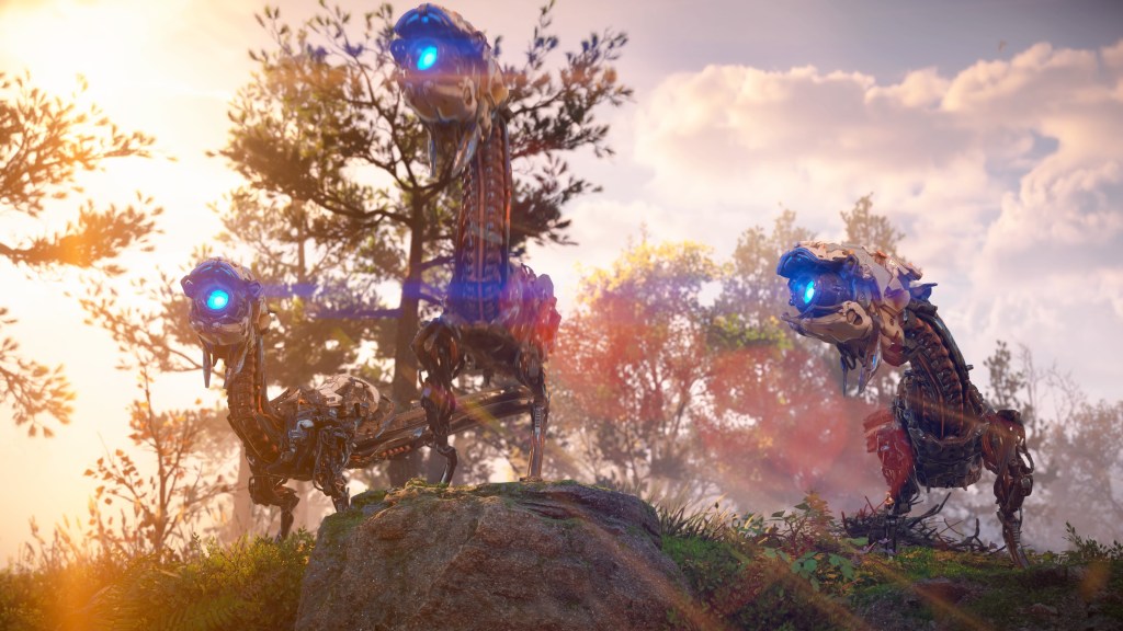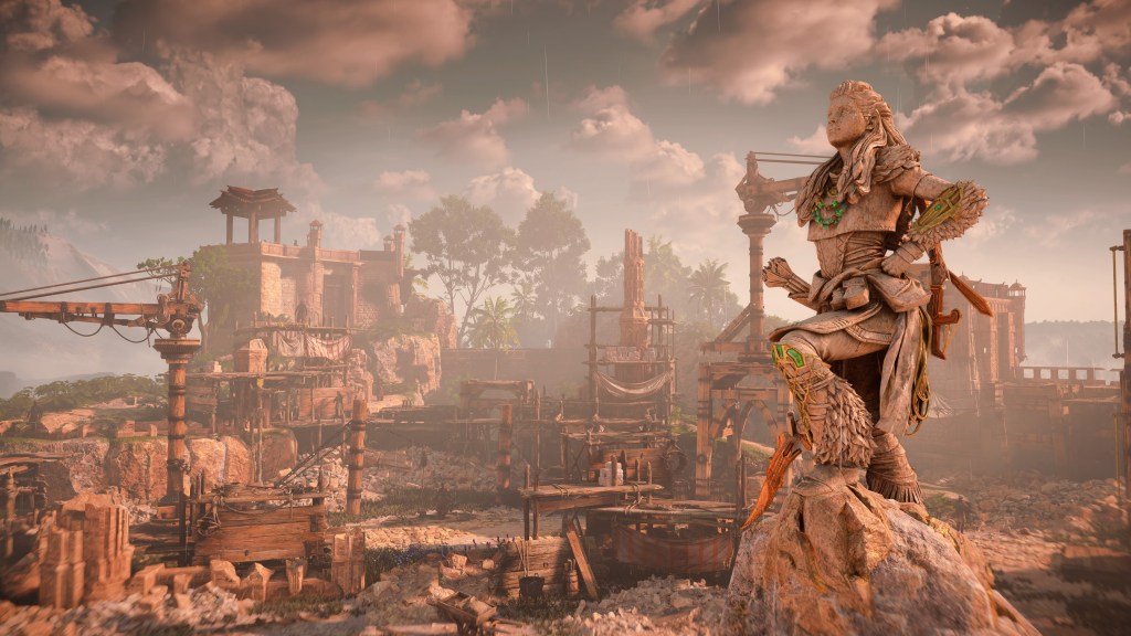 Il est grisant d’explorer un monde à la fois futuriste et primitif. Privés de toute forme de technologie avancée, les différents peuples portent des tenus traditionnelles et vivent en harmonie avec la nature. Ils n’ont pourtant pas à affronter des prédateurs comme les autres. Alors que les animaux se font rares, la terre est foulée par des machines, inspirées de créatures herbivores, carnivores voire de… dinosaures. Certaines machines sont non seulement impressionnantes, mais aussi très menaçantes. La faune et la flore d’Horizon Forbidden West proposent un contraste saisissant, et d’autant plus beau que les graphismes sont magnifiques. Alors que les plaines sont colorées de fleurs multicolores, les machines mécaniques continuent leurs rondes. Lorsqu’Aloy s’aventure dans des ruines appartenant à un autre âge, elle ne tombe pas sur des décombres datant de l’Antiquité Romaine ou de la Préhistoire, mais sur des immeubles plus sophistiqués que les nôtres. Il est incroyable de tomber sur les ruines de Las Vegas, ou encore sur une statue dite antique, représentant un homme habillé de façon presque contemporaine.
