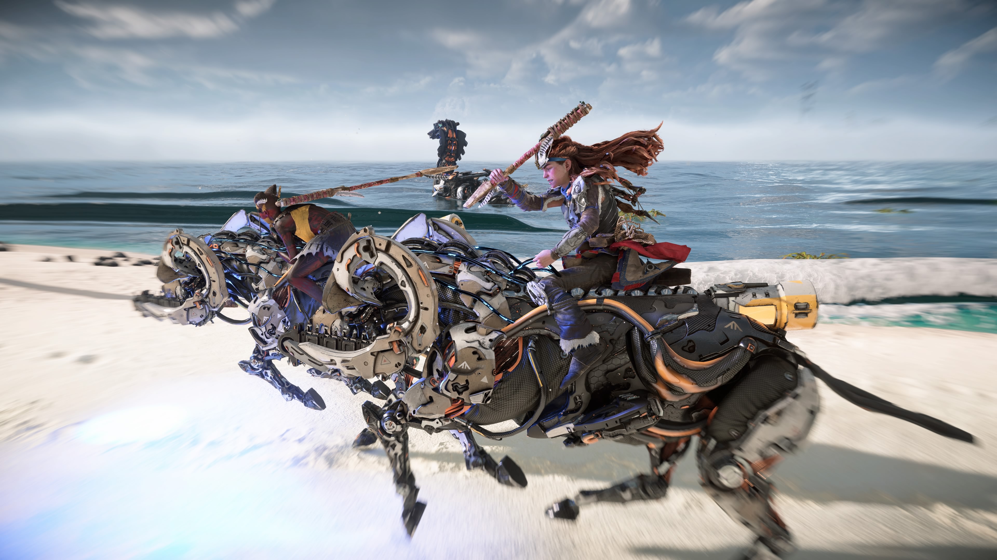 J’ai particulièrement apprécié l’exploration du monde qui se fait toujours de manière progressive, grâce à la possibilité de pirater les grands-cous, qui éclaircissent la carte. Horizon Forbidden West propose une verticalité beaucoup plus aboutie que dans le premier épisode. Venir à bout d’un grand-cou donne véritablement la sensation de gravir des sommets et d’accomplir des prouesses. Les épisodes de plate-forme sont rondement bien menés. Qui plus est, Aloy n’est pas obligée de se déplacer à pieds. Elle peut pirater différentes montures, (dont une ressemblant à un fucking vélociraptor), mais aussi emprunter la voie des airs, ce qui est particulièrement grisant.