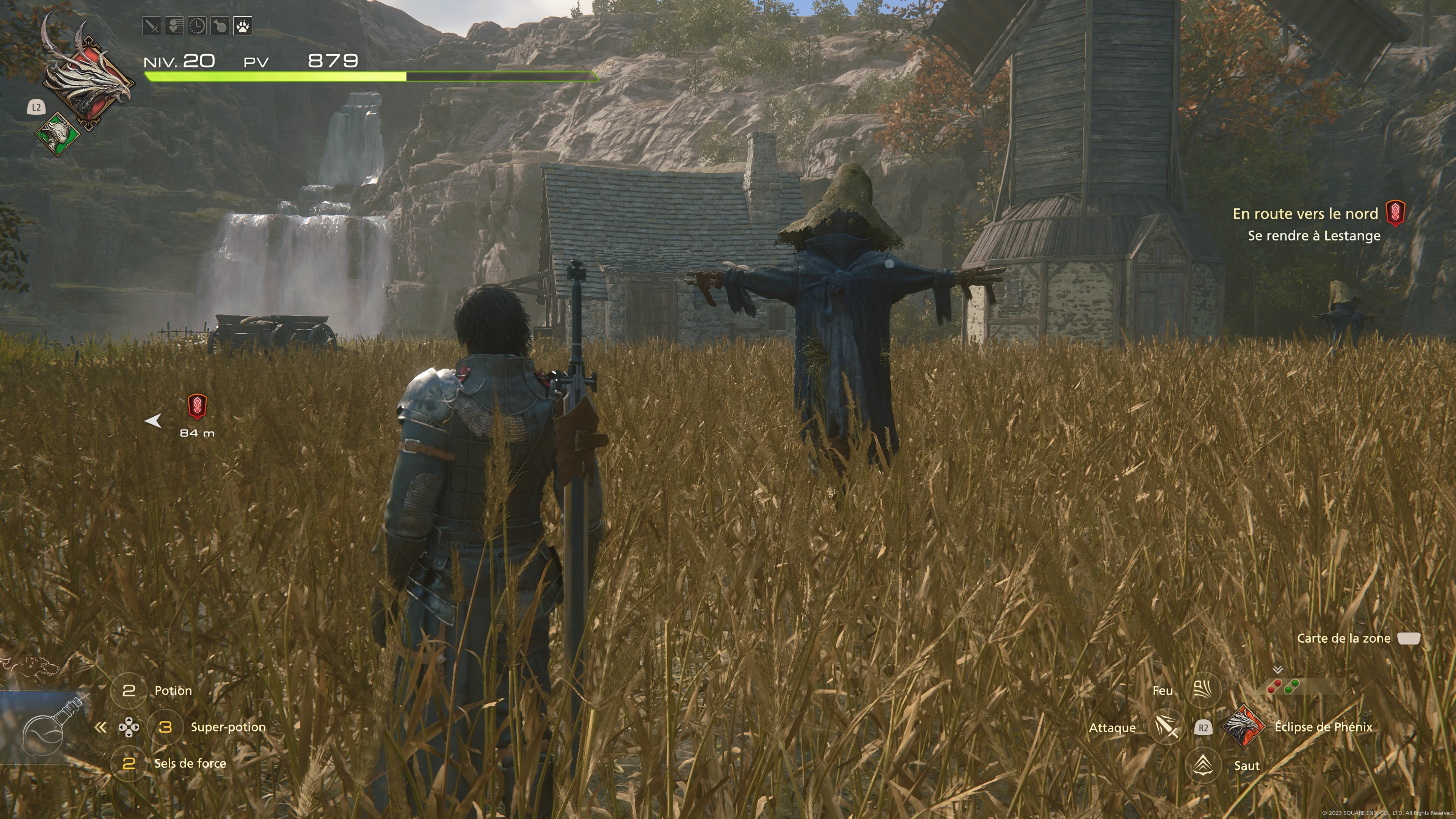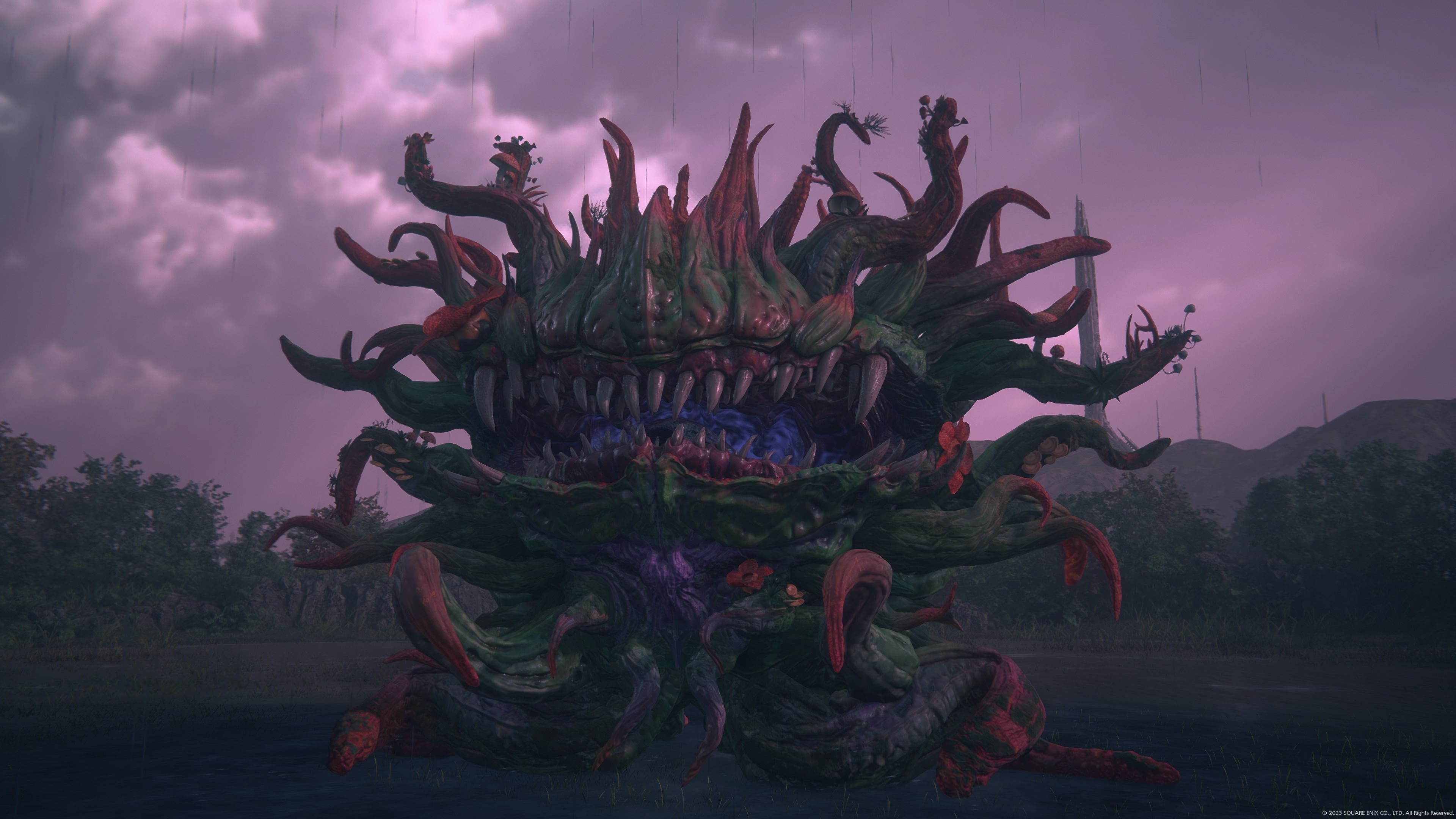 Fort heureusement, Final Fantasy XVI est pourvu d’un lore tout à fait passionnant, qui permet de se familiariser avec ce qui constitue l’ADN de la série, ou encore de retrouver des éléments familiers. Les références aux titres précédents sont nombreuses, sans pour autant devenir omniprésentes ni gratuites. Au contraire, elles sont amenées de manière intelligente. Ainsi, comme l’exige la tradition, un personnage s’appelle Cid. Clive récupérera lui-même ce nom quand il deviendra à son tour le chef du repaire. On comprend ainsi que Cid n’est pas seulement un prénom, mais aussi un titre honorifique, ce qui expliquerait pourquoi tant de personnages se sont nommés ainsi, jusqu’à présent. La monture de Clive est naturellement un Chocobo. Le repaire abrite un Mog, qui met à jour le tableau des cibles d’élite ; enfin, certaines fermes abritent des épouvantails ressemblant étrangement aux mages noirs des premiers épisodes, ou plus simplement à Bibi dans Final Fantasy IX. Le bestiaire est constitué d’ennemis ou de monstres connus, bien que je regrette son manque de variété. Ainsi, chaque région abrite plus ou moins les mêmes créatures et les cibles d’élite elles-mêmes ne sont pas marquantes.