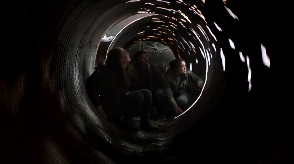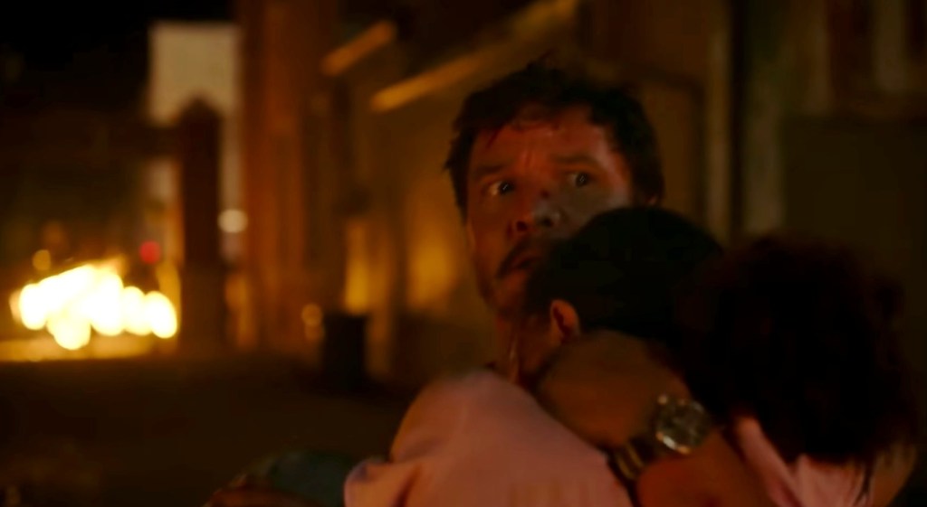 Si l’épisode 8 se concentrait sur Ellie, l’épisode 9 suit davantage le point de vue de Joël. Force est de constater que, en dépit de passages survolés, la qualité de l’écriture et celle du jeu de Pedro Pascal rendent Joël merveilleusement ambivalent. Ainsi, il est extrêmement touchant dans la première partie de l’épisode. Il se conduit comme un père avec Ellie, à qui il tente de rendre le sourire. Après le passage des girafes, il est perceptible qu’il redoute de l’amener à l’hôpital, car il craint de la perdre. Contrairement au jeu vidéo, Joël a une petite cicatrice sur le visage dont il révèle enfin l’origine à Ellie. Il admet avoir tenté de mettre fin à ses jours, juste après la mort de sa fille. Ellie lui répond alors que le temps guérit toutes les blessures, mais Joël n’est pas de cet avis. Il sous-entend clairement que c’est la jeune fille qui lui a permis de guérir. L’amour qu’il porte à Ellie n’est pas totalement désintéressé car elle lui permet de finir son deuil, mais il n’en est pas moins puissant. Joël semble bien vulnérable et en proie à des sentiments très forts pour elle. On en éprouve une empathie d’autant plus affirmée pour lui. Et pourtant, la deuxième partie de l’épisode parvient à le montrer sous un tout autre jour. Lorsqu’il décide de porter secours à Ellie, Joël s’empare d’une arme et tue les Lucioles dans l’hôpital, à tour de bras. La scène est brève mais la mise en scène extrêmement percutante. Joël tue ses ennemis de façon impitoyable, même lorsqu’il sont désarmés ou tentent de se rendre. Les gros plans sur les Lucioles sans vie les désignent comme les victimes de l’histoire. La réorchestration sourde du thème musical rend la tuerie encore plus mélancolique. Joël a l’air d’un tueur de masse impitoyable, et non plus du protagoniste de l’histoire. Il n’a pas plus de pitié face au chirurgien, qu’il tue d’une balle dans la tête ; ni face à Marlene, qu’il achève afin qu’elle ne pourchasse pas Ellie. Enfin, lorsqu’ils se dirigent vers Jackson, Joël parle avec enthousiasme de Sarah, signe qu’il a enfin terminé son deuil, mais aussi qu’Ellie ne sert peut-être qu’à combler un vide. Pire que tout, il persiste à lui mentir, même quand elle lui demande de jurer de dire la vérité.