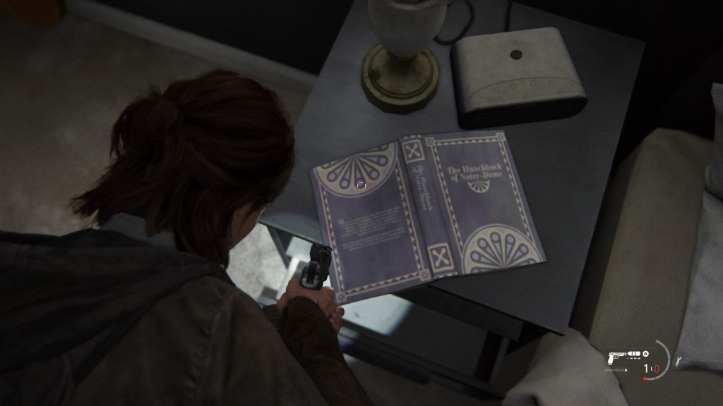 Notons qu’une grande partie de l’analyse s’appuie sur mon interprétation, qui, inutile de le rappeler, est subjective. Le flot de symboles et de métaphores n’en est pas moins très important. Il l’est tant que cet article ne pourrait jamais être exhaustif. Je pense à la métaphore maritime, l’eau déchaînée n’étant que l’incarnation de sentiments et émotions contraires. Je pense à la métaphore du théâtre, qui est l’un des lieux phares de cette Partie II, où se passe l’un des climax majeurs. C’est dans ce même théâtre que le joueur découvre notamment une affiche de Demain dès l’aube, alors qu’un exemplaire de Notre-Dame de Paris est posé sur le chevet d’un motel. Je me plais à considérer ces références à Victor Hugo comme le signe que The Last of Us Part II doit être considéré comme un drame ou une tragédie, où chaque personnage est la projection d’un autre. Ce n’est pas un hasard si Ellie et Abby sont si proches, ou sont au cœur de triangles amoureux. Par dessus-tout, l’œuvre de Victor Hugo est réputée pour mettre en scène des protagonistes qui sont plus des symboles que des individus à part entière. Et si c’était aussi le cas d’Ellie et Abby ? Et si elles n’étaient finalement que les masques, légèrement différents, qu’endosse le joueur, aux différentes étapes du parcours ? Ou devrais-je dire aux différentes étapes du deuil ?