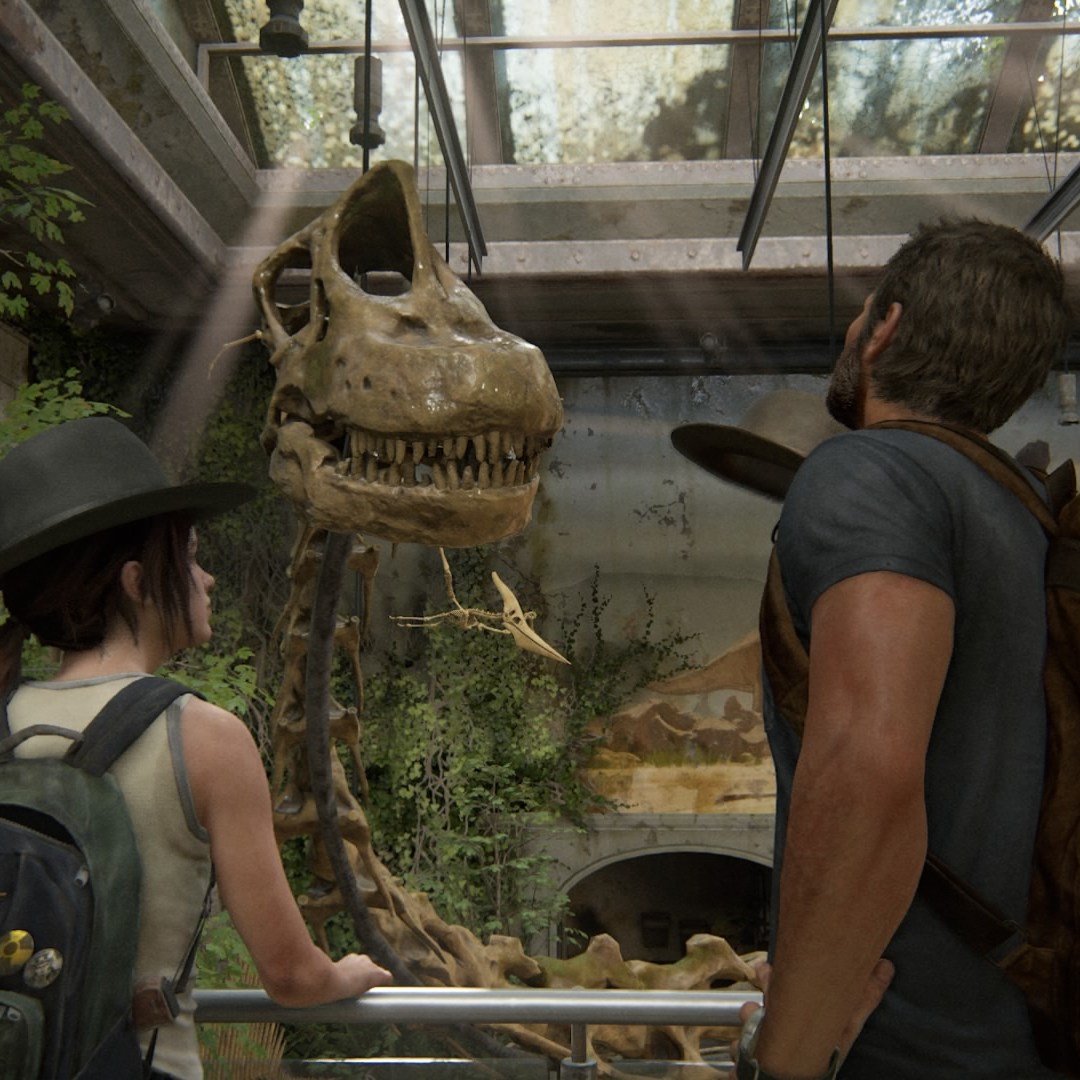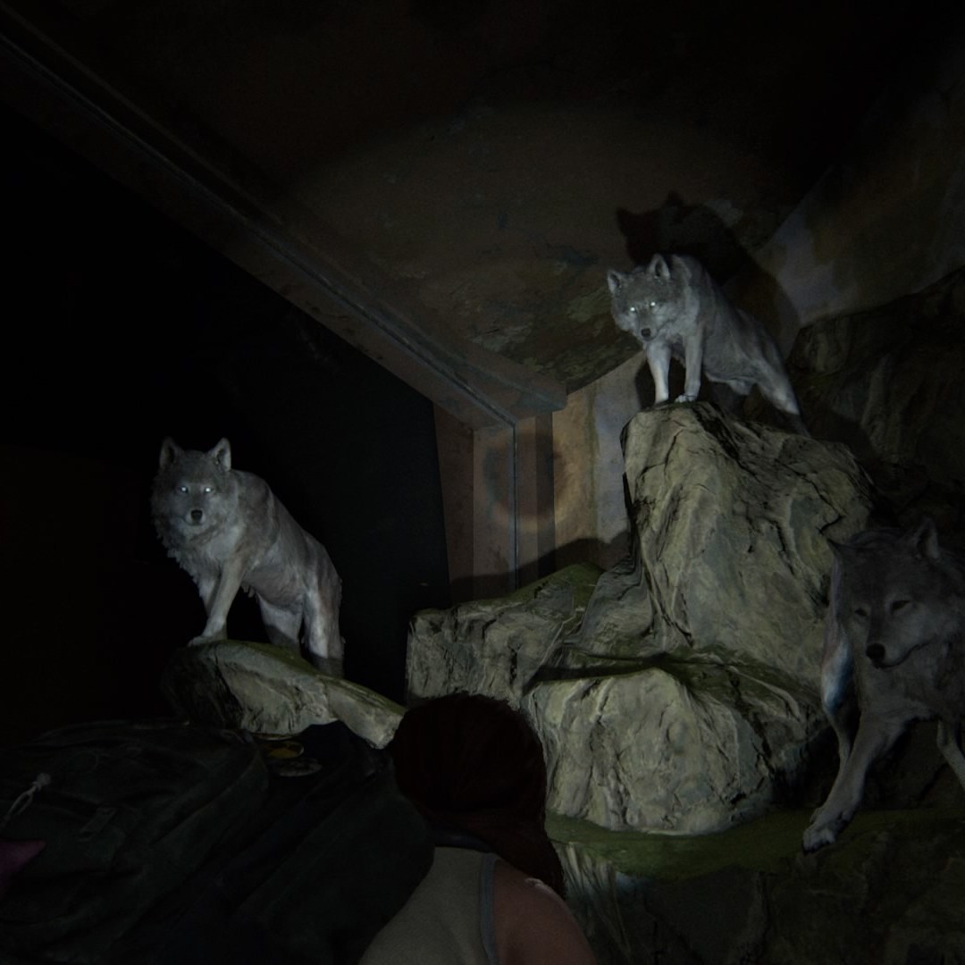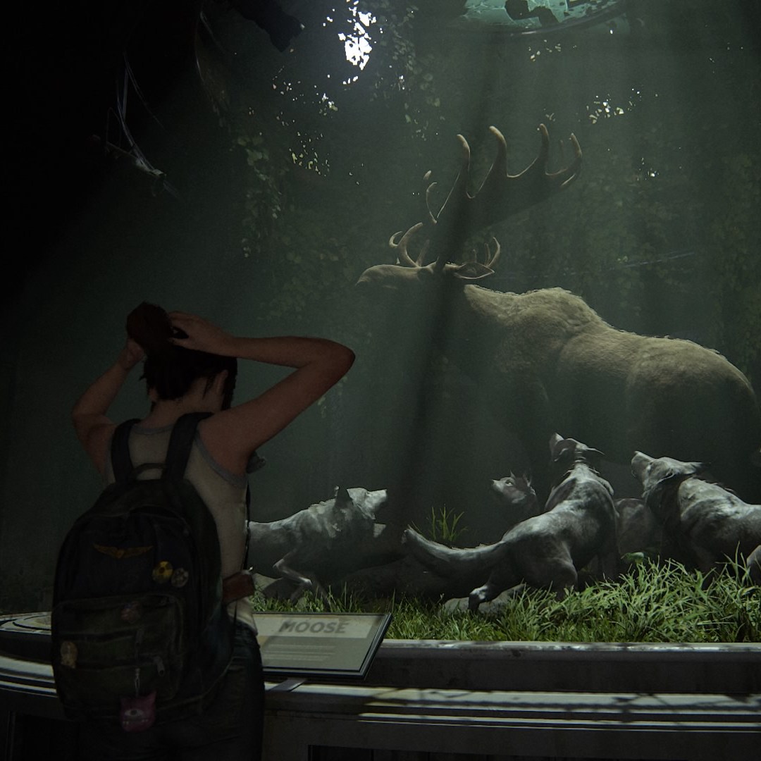 The Last of Us est une saga se plaisant à manier l’art de l’allégorie. Dès le premier opus, les métaphores animales étaient très présentes. Le groupe des Lucioles était destiné à donner de l’espoir, et à guider l’humanité vers la lumière. L’affiche du film Dawn of the Wolf, trouvable un peu partout en ville, et représentant un loup-garou enlaçant une jeune fille de manière protectrice symbolisait la relation entre Joel et Ellie. La marche des girafes, hors du zoo, était la métaphore de la délivrance des deux protagonistes. Et je n’invente rien, puisque tout cela est rapidement mentionné dans l’Artbook du premier jeu. La scène de la girafe est d’ailleurs si marquante qu’elle trouve plusieurs échos dans la Partie II. Dès le début du jeu, Ellie tombe sur une peluche de girafe. Lors du premier flash-back entre la jeune fille et Joel, le plan avec le squelette du brachiosaure ressemble à s’y méprendre à celui de la girafe. On peut peut-être même voir un écho à cela au cours du flash-back dans l’aquarium, lorsque Owen et Abby aperçoivent le phoque tacheté. Les deux jeunes femmes ont des souvenirs – heureux ou malheureux – en commun.